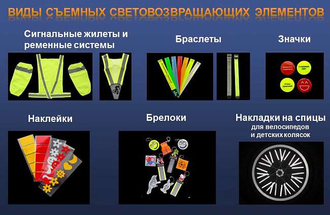 Кроме того, и дети, и взрослые могут носить светоотражающие браслеты. Они представляют собой изделия из металла или ткани. Для детей подойдут также самофиксирующие варианты.