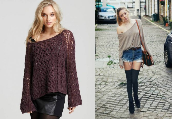- С бретелью — деталь, созданная для удобства. Она не позволяет свитеру сильно сползать. Бретель используют для деловых фасонов, в строгом классическом стиле. Изделия с широкой деталью помогут создать офисный образ.