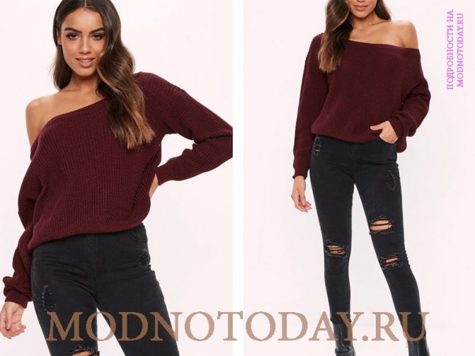 - Вырез лодочкой — позволяет тактично оголить одно плечо. При желании свитер носите, как обычный, особенно если нужно создать деловой образ в рамках офисного дресс-кода. В таком случае, изделие оголяет только ключицы.
