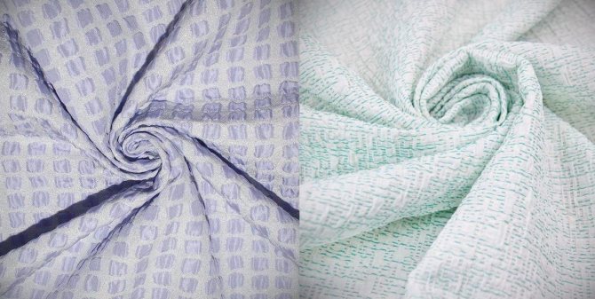 Всех их объединяет сжатая структура этой ткани, которая напоминает выбитый рисунок. Так же данный материал можно сравнить с таким материалом, как жатый шелк.