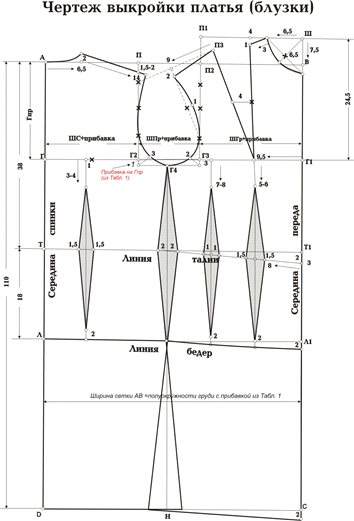 - по линии талии делают метки для вытачек по боковому шву и по одной на спинке и полочке, равномерно распределяя разность полуобхвата груди и талии;