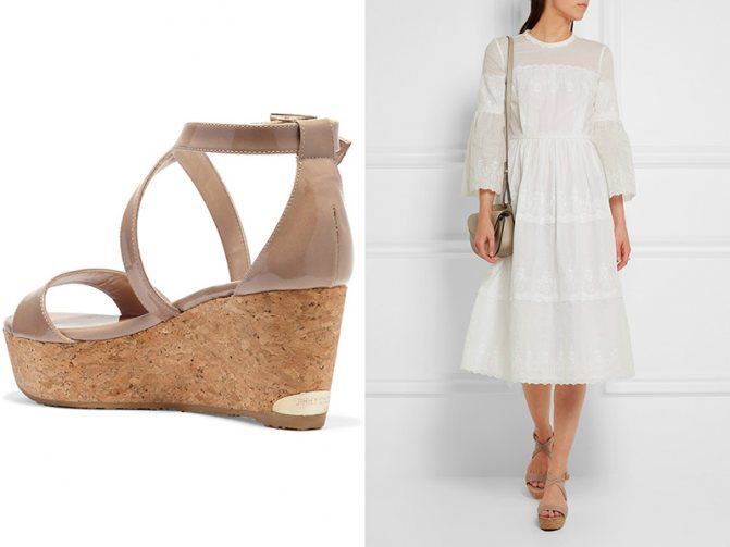 Для вечернего платья синего или кремового цвета подходят замшевые босоножки в бежевой цветовой гамме. Выполненные из коже, они очень даже будут к месту с брючным деловым костюмом. А бежевые босоножки с пробковой подошвой хорошо сочетаются с летними легкими нарядами: летящими платьями, сарафанами, джинсовыми шортами.