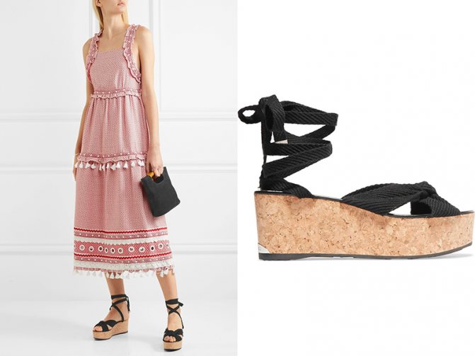 Невозможно представить пляжный образ без обувной пары на танкетке. Чаще всего это максимально открытые модели, которые удобно обувать. Эффектно выглядят босоножки с перемычками либо лаконичные пары по типу сабо. Пляжный лук не требует соблюдения формальностей, поэтому в образе могут появиться яркие и оригинальные вещи. Например, красные босоножки освежат модный аутфит и сделают любую женщину королевой пляжных вечеринок.