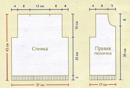 Переходим к полочке. Ширина ее – 33 п. на спице. Спицами провязываем ее по той же схеме, что и заднюю часть кофточки для девочек. Рукав выполняем по схеме ниже: начинаем с 37п. Горловину отдельно обвязываем резинкой. Затем можно все детальки сшивать вместе.