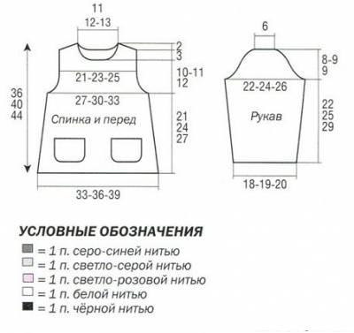 Подойдет для девочек от 2 до 6 лет. Кофточку будет вязать из ниток ярко-розового, серого, белого и черного цветов. Будут использоваться несколько типов вязки. Гладь лицевая – ИП – во всех изнаночных рядах, ЛП – во всех лицевых рядках. Платочный метод – все рядки – лицевыми петельками. Жаккардовый рисунок – лицевая гладь, когда цвет меняется, то нитки перекрещиваются с изнаночной стороны, чтобы не было отверстий. Убавлять всегда провязывая вместе 3 и 4 п. от края. Спинка. Серыми нитками набираем 93/99/107п. Вначале идут 2 р. платочной вязкой. Далее начинаем гладь лицевую. Убавление: каждый 10 р. – 2 в 1п.. с обоих краев провязываем вместе; каждый 8 р. – 6 в 1 п. Через 80/88/100 р. начинаем закрывать проймы. Для этого 3 в 1 п. в каждом втором рядке. От края проймы до ее окончания выполняем примерно 13/14/15 см рисунка. Переходим к скосам плеч. От краев закрываем через ряд по 3 петли. Одновременно начинаем делать вырез для горловины.