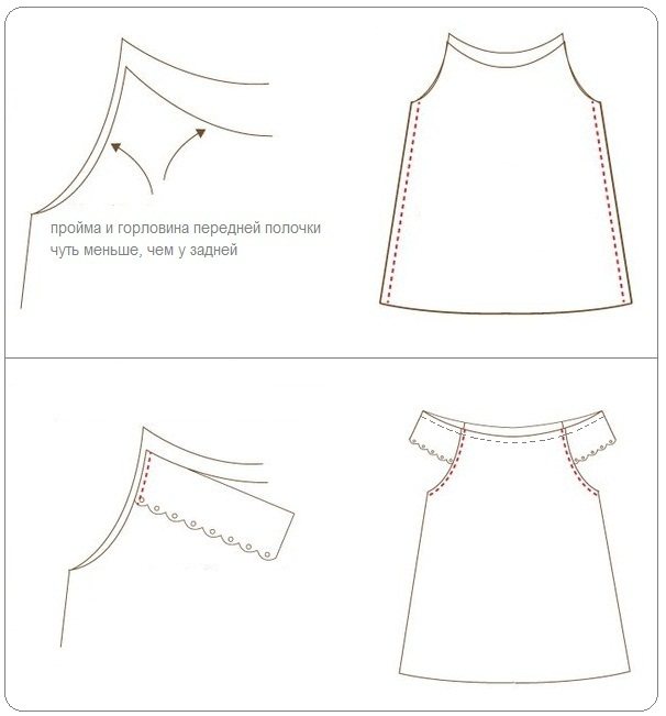 - Пришить кружево к передней и задней полочке, как показано на схеме выше.