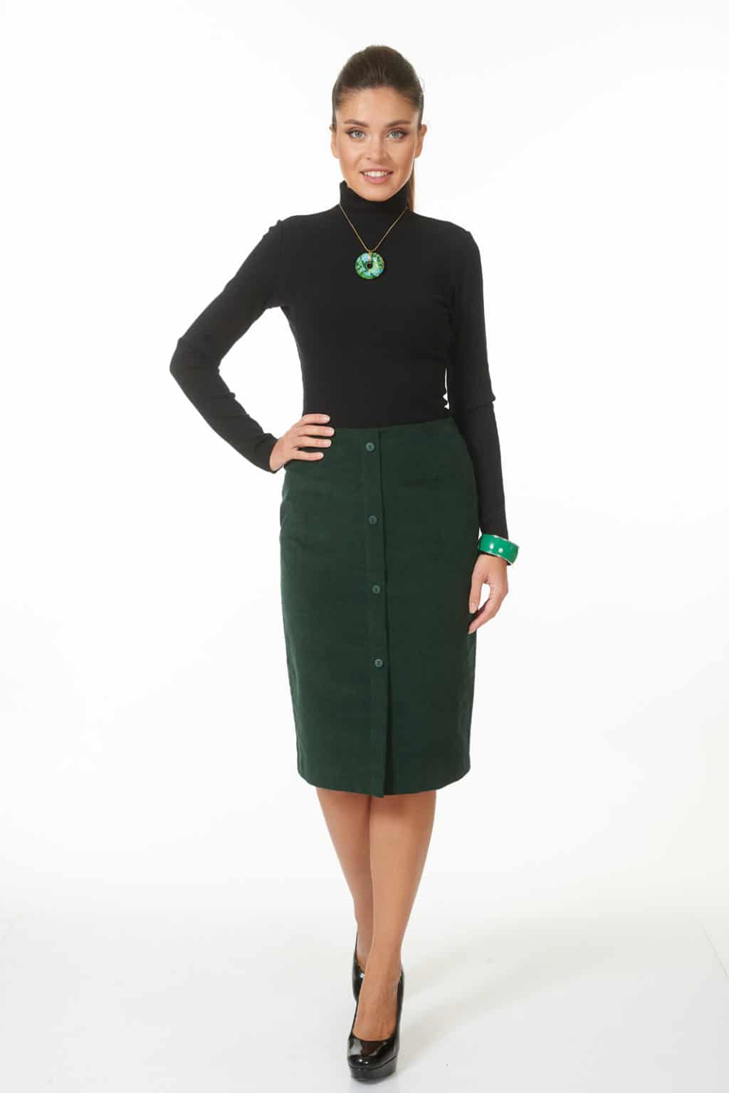 В трикотажном варианте юбка карандаш на пуговицах смотрится так же эффектно. Такая юбка длинной ниже колен в комплекте с темной водолазкой, и черными ботинками, хороший вариант для холодного времени года.