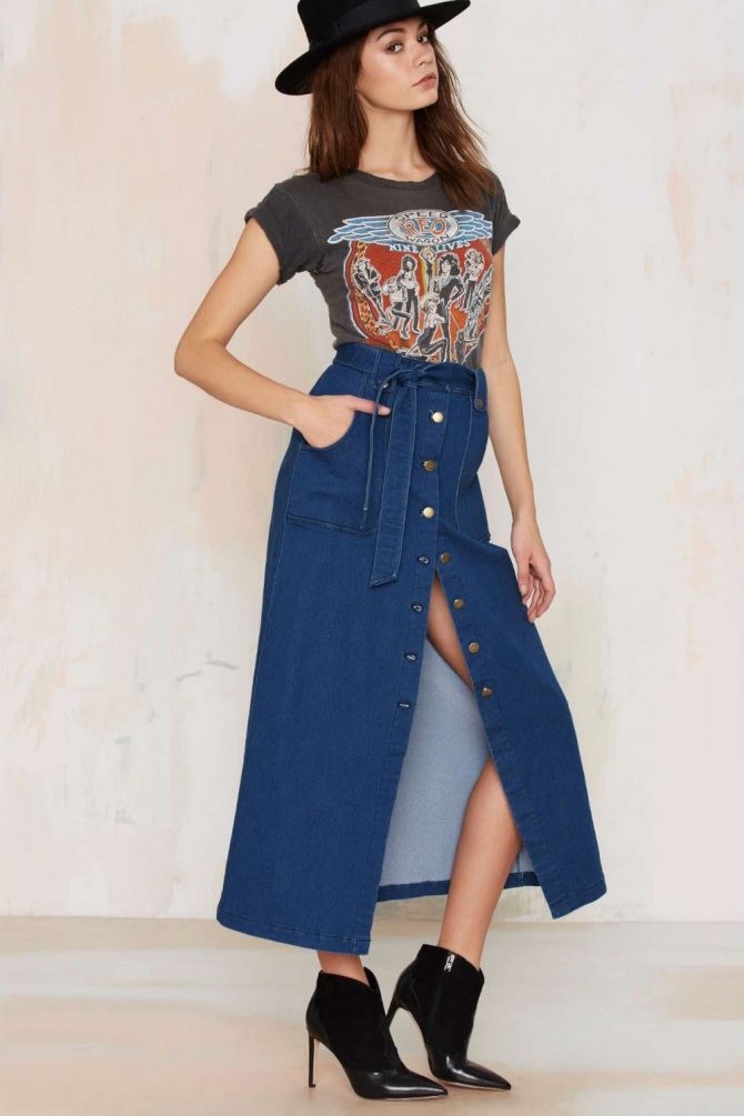 Стилисты обратили внимание на джинсовые юбки с пуговицами впереди, варианты с высокой посадкой, миди и макси варианты. Все их допускается носить с ремешком.
