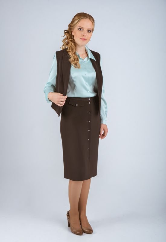 Для делового костюма идеальная комбинация – низ темных оттенков и светлый верх. В качестве верха лучше отдать предпочтение блузкам. Обувь для завершения образа лучше всего подбирать на каблуке, особенно низкорослым девушкам.