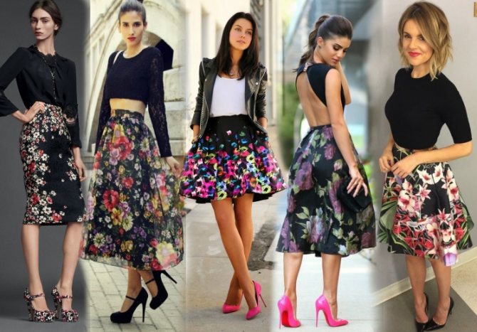 Цветочные юбки черного цвета и варианты образов с ними