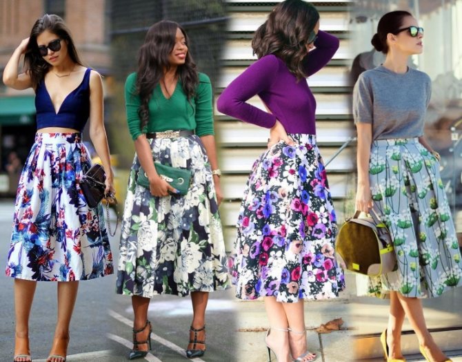На фото примеры юбок миди длины с цветочным принтом и однотонными топами