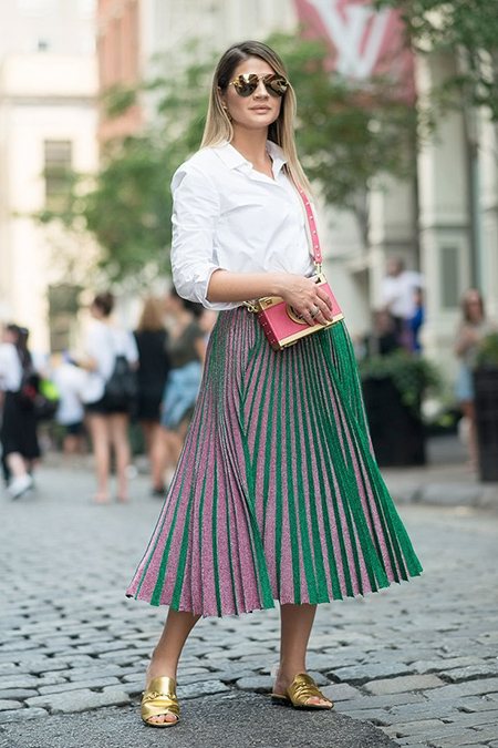 Блузки для комплекта с плиссированной юбкой лучше предпочитать из похожих на шифон материалов. Это могут быть как белые, молочные, нежные пастельные оттенки, так и яркие изделия в тон низу образа. Для следования трендам можно сочетать белую лаконичную блузку с юбкой металлик. Дополнить образ помогут лоферы и небольшая сумка на ремешке.