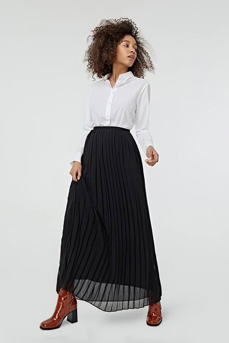 - Черные модели плиссе до колена подойдут не только школьницам, на самом деле это базовая вещь. Она будет незаменима в гардеробе любой девушки.