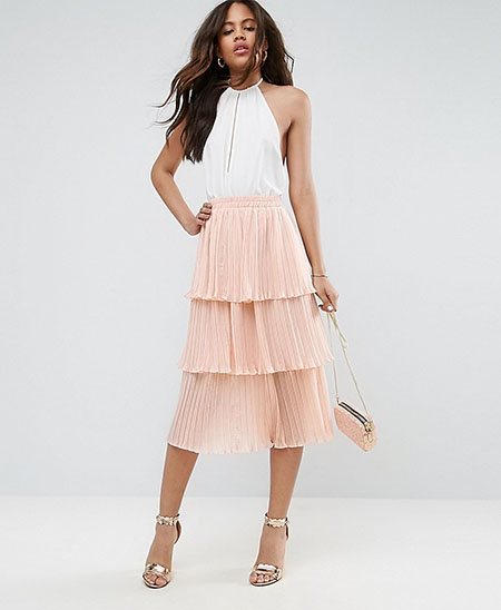 - Летом, в жаркий период для прогулок по городу или шопинга рекомендовано сочетание макси юбки плиссе с футболкой или открытым топом. Это могут быть модели из кружева, трикотажные лаконичные топы, открывающие живот. Дополнить образ можно оригинальными украшениями на шею и клатчем в тон юбки. Из обуви для такого образа подойдут кеды белого либо пастельного оттенка.