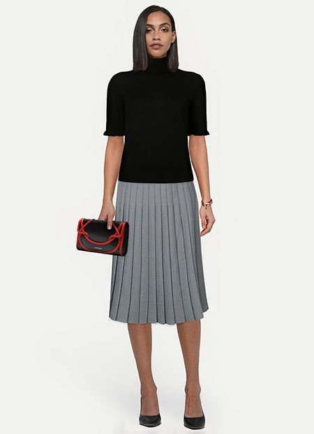 Если говорить об офисном луке, то здесь потребуется темная, не слишком короткая плиссированная юбка из плотного материала. В качестве верха лучше всего подойдет белая блузка либо рубашка, сверху — укороченный жакет в тон юбки. Дополнят стильный образ туфли на устойчивом каблуке и офисная сумка.