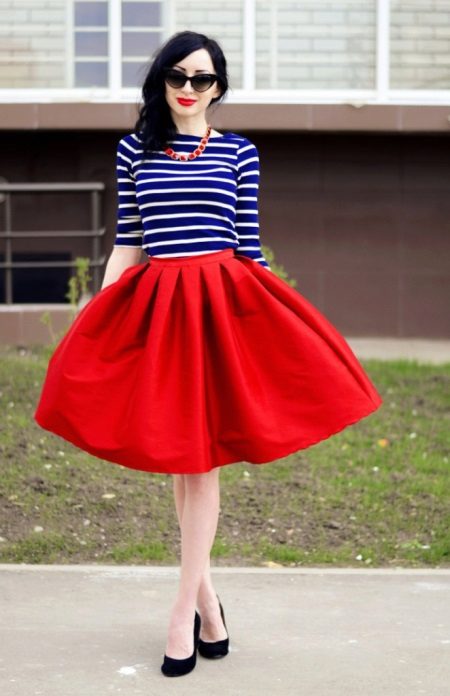 Эффектный коктейльный образ позволит создать тельняшка, заправленная в пышную юбку-миди с высокой талией.