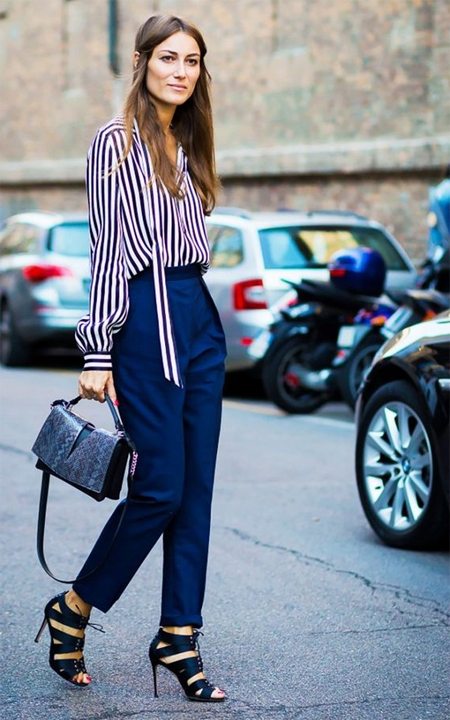 Тельняшка с брючным костюмом — такой образ очень полюбился француженкам, он делает модель не только элегантной, но также уместной и для выхода «в люди» и для работы в офисе.