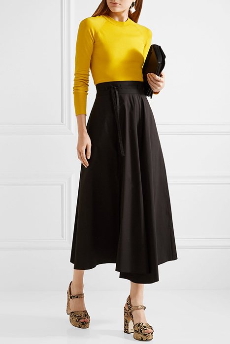 - Еще один свежий образ для обычного летнего состоит из белоснежной юбки покроя солнце, облегающего черно-белого топа с фантазийными узорами и босоножек гранатового цвета на пробковой танкетке. Дополняет образ черная бесформенная сумка-торба и кожаный пояс в цвет обуви.