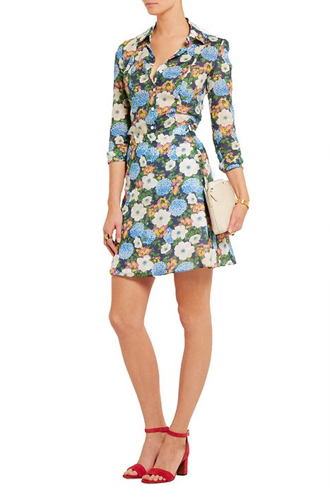 - Женственное синее платье А-образного силуэта с белым цветочным узором наденем с коротким легким кардиганом без застежки. Дополнениями послужат босоножки томатного оттенка и красно-коричневый пояс на талии
