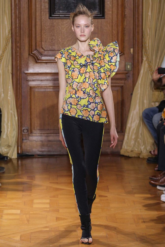 Блузка желтого цвета с цветочным принтом из коллекции модного дома Viktor&Rolf асимметричного покроя, без рукавов, с воланом сочетается с облегающими брюками черного оттенка и босоножками черной расцветки на плоской подошве от Viktor&Rolf.