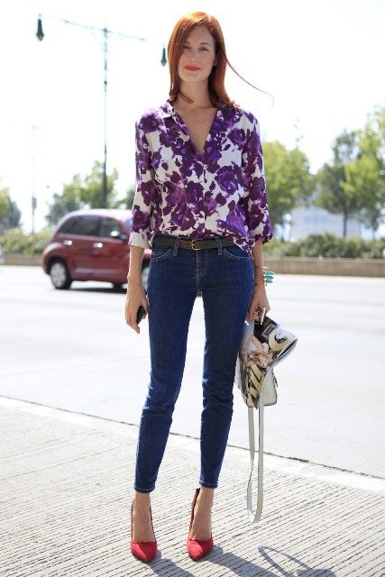 Хорошим дополнением блузки с сиреневым цветочным принтом, с рукавами в три четверти, станут облегающие джинсы синего цвета, небольшая сумка белого тона и туфли красной расцветки на высоком каблуке.