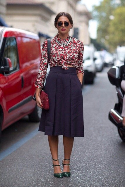 Короткая блузка с красным цветочным принтом на светло-сером фоне, с длинными рукавами великолепно сочетается с темно-серой юбкой в складку, длиной ниже колен, клатчем бордового тона и лаковыми туфлями темно-зеленой расцветки на высоком каблуке.