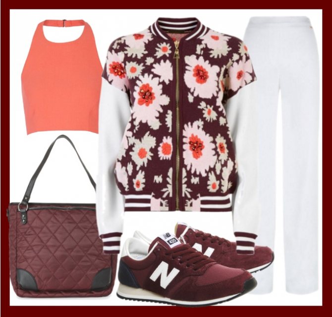 В рамках подстиля спорт-кэжуал можно использовать жакеты нейтрального фасона, похожие на пиджаки со скругленными полами. Допускается носить такой жакет с кроссовками и широкими штанами, из обуви можно выбрать кеды или слипоны, подойдут плиссированная юбочка и теннисные туфли. Примерьте бордовый кэжуал-жакет с трикотажным платьем-поло в сине-белой гамме и белыми кедами.